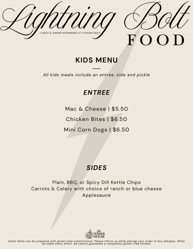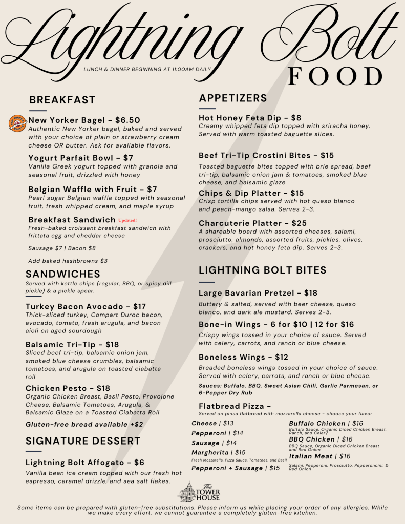 Our food menu is now available. You may order inside at our Lightning Bolt Coffee Kiosk and enjoy our café style food and drink experience. Please call 715-671-0024 to place a takeout order in advance.
